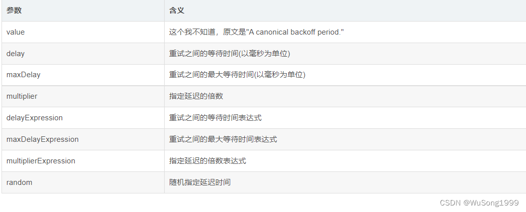 Every subsequent retry is the previous 1.5 times (Backoff(delay = 100L, multiplier = 1.5))@Backoff Note the functions of each parameter as follows