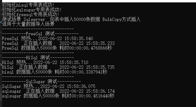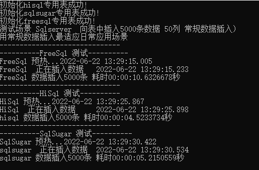 stay 2022 year 1 I did it once in July sqlsugar,hisql,freesql Performance test of three frameworks , Last time it was mainly measured sqlserver General insert under ( Not bulkcopy Data insertion ),hisql Compared with the more popular ORM Framework performance test comparison Half a year has passed , This time I will test a more complete test scheme as follows