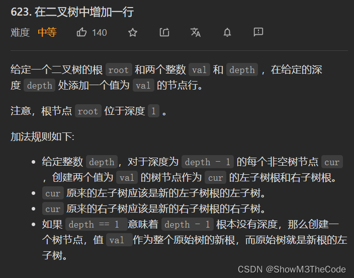 623. Add a line to the binary tree https://img blog.csdnimg.cn/fe8a58b689a74b78bdb2b85d1d0202bf.png Code implementation (self-solving) // / / Definiti...